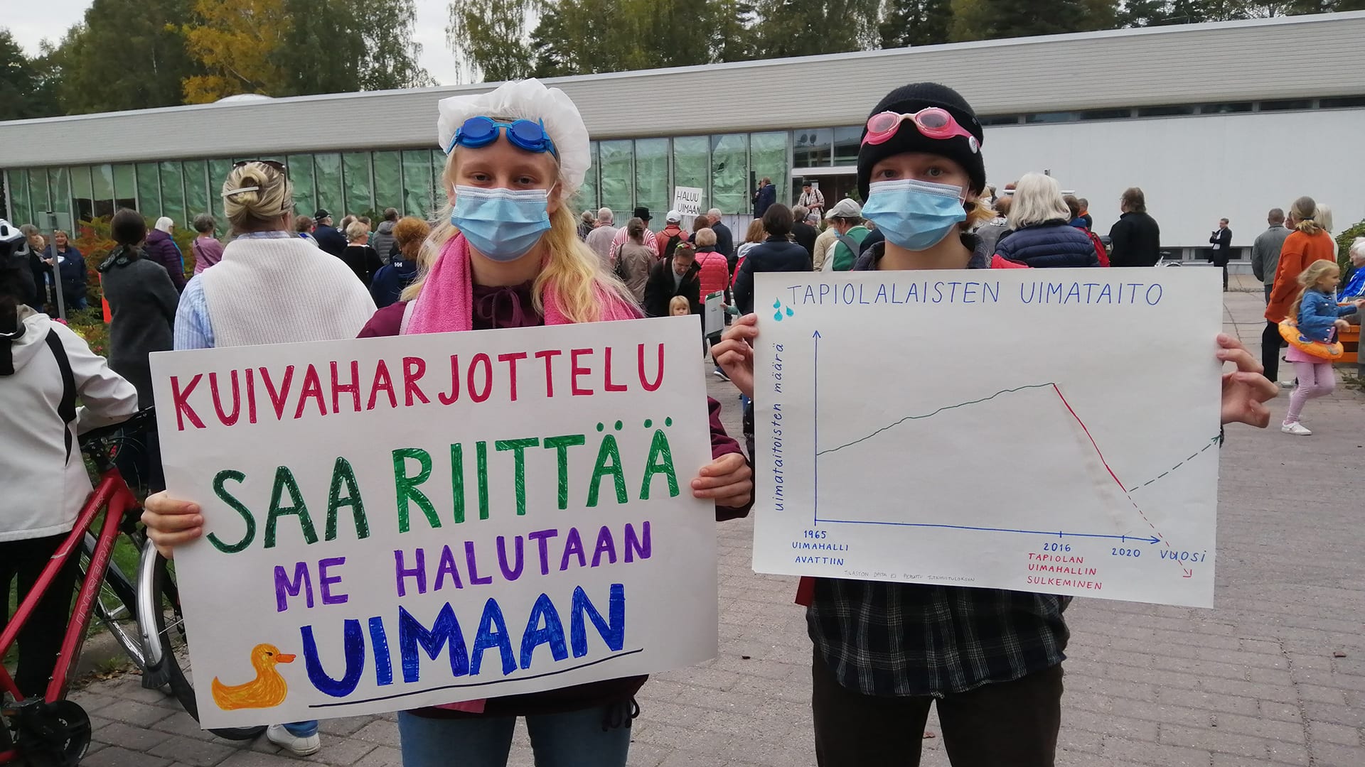 Tapiolalaiset kokoontuivat mielenosoitukseen puolustamaan uimahalliaan Osallistujien mukaan Aarne Ervin suunnittelema uimahalli kuuluu erottamattomana osana Tapiolan kulttuurimaisemaan. Halli on ollut pitkään kiinni rakenteellisten ongelmien vuoksi.29 s Käynnistä ohjelma